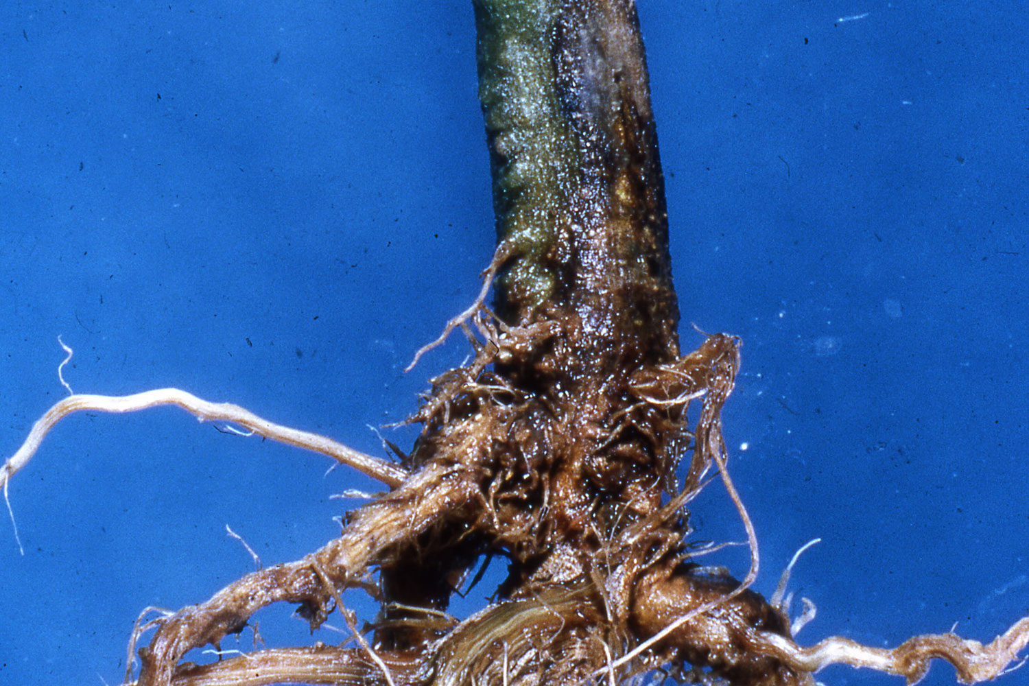 Hastalık ilerlediğinde, bütün kök sistemi kahverengi olur ve kazık kök genellikle çürür. Toprak çizgisinde ya da yakınında çikolata kahvesi lezyonlar gelişir ve vasküler sisteme doğru genişler. Bu kahverengi vasküler renklenme, tipik olarak toprak çizgisinin 25 cm (10 inç) üzerinden daha fazla genişlememesiyle Fusarium solgunluğundan ayırt etmek mümkündür. Bundan dolayı nem yeterli olduğunda, maruz kalan lezyonlarda fungal sporlanma gözlemlenebilir.