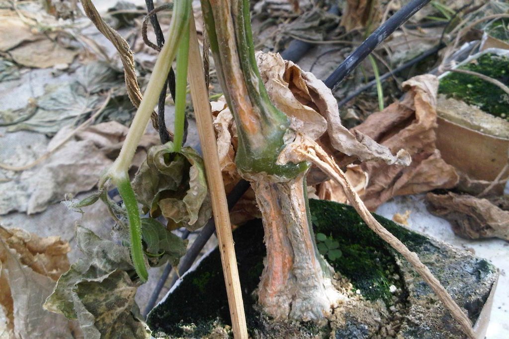 Hıyar Kabakgillerde Fusarium. Kabuk dokularının dökülmesine neden olmaktadır. Şiddetli enfekte olmuş bitkilerde gövdenin dışında pembemsi, turuncu makrokonidyum ve mikrokonidyum kitleleri ve pamuksu miselyum büyümesi gözlemlenmektedir. Yüksek oranda meyve yükü olan bitkiler, özellikle yüksek sıcaklıklarda yetiştirildiğinde, kahverengiye dönerek ölürler.